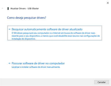 - O símbolo de atenção em amarelo indica que o driver está desatualizado, selecione a opção Atualizar driver clicando com o botão direito do mouse em cima do USB-Blaster, a janela a baixo deverá abrir: