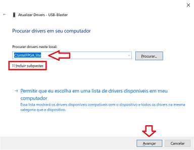 - Selecione a opção Procurar software de driver no computador e defina o caminho da pasta do driver que foi baixado no passo 1. (Exemplo: "C:_USB-Blater_DE0-CV"), selecione incluir subpastas e clique em avançar:
